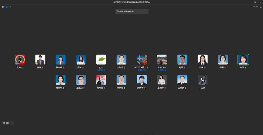 11月21日,太阳集团tyc122cc通过企业微信线上会议形式召开2023年国家社科基金项目申报选题论证会,本次会议有幸邀请重庆大学曹跃群教授、重庆工商大学曾庆均教授进行在线指导。太阳集团tyc122cc院长宋瑛教授及国家社科基金项目申报人员出席本次论证会,会议由财税系主任韩健教授主持。
