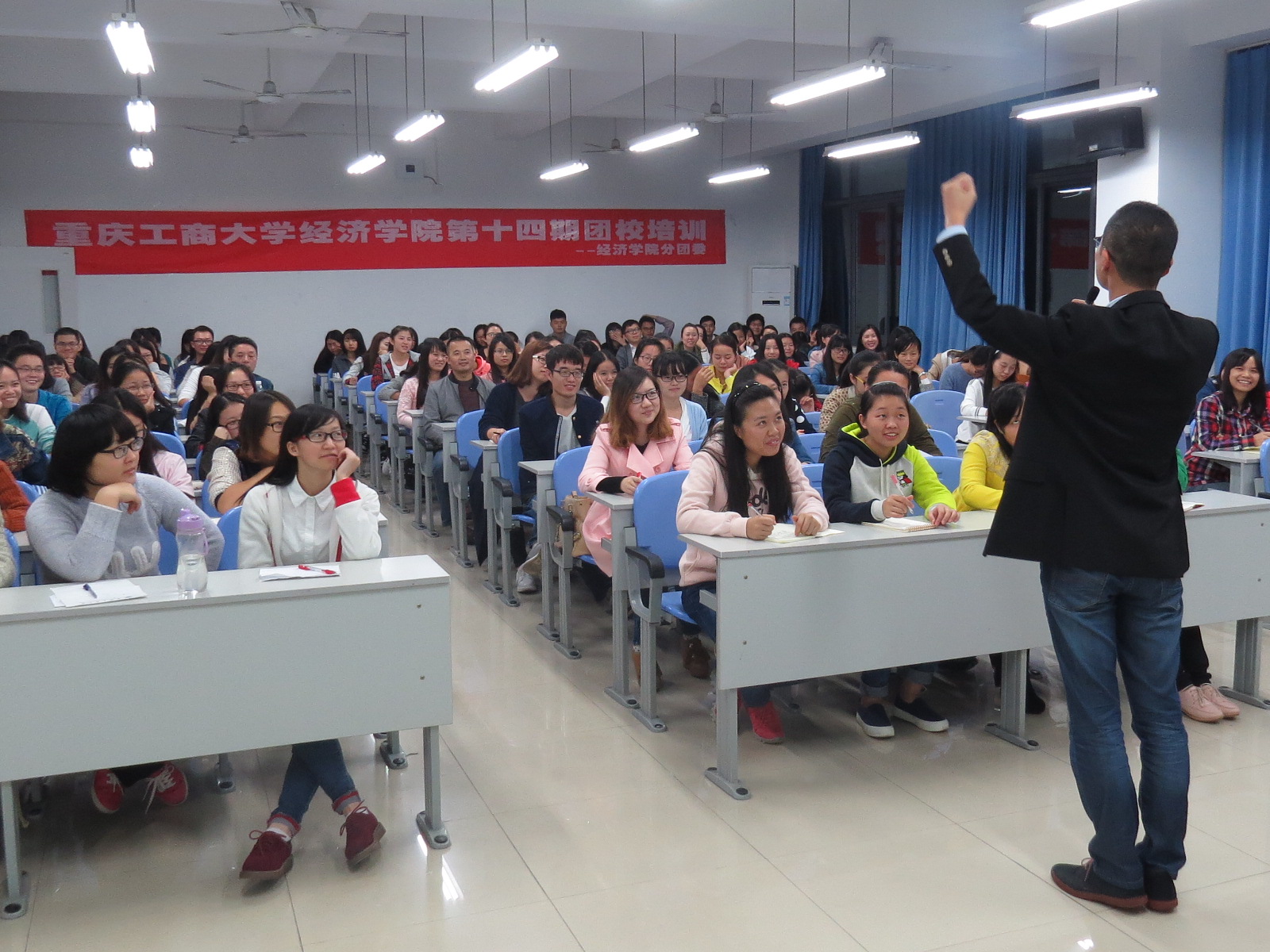 本次团校培训包括学生干部能力培养、演讲与面试技巧讲解以及PPT设计与制作三个版块,旨在提高班团干部的综合素质,让他们在学习、工作和生活中更好地发挥带头作用。在学生干部能力培养版块中,校团委陆嘉老师表示,作为学生干部,理性的思维能力能够让我们更好地处理与同学、老师之间的关系,而对社会的理性认知和成熟的思想能够让我们时刻保持清醒的头脑,减少工作中的错误。她还表示,学生干部一定要学会思考,工作要接地气,只有接地气才能更好地开展工作。在演讲与面试技巧版块,重庆市演讲爱好者协会秘书长赵言老师从演讲技巧在面试中的重要性、演讲七要素和大学生面试现状等方面向大家介绍了一些演讲基本技巧。他表示,优秀的演讲者会在面试中脱颖而出,在演讲时不仅要做到以听众为中心,恰到好处的肢体语音同样也可以增强演讲效果。他还强调“真、新、潮”这三个字是面试的法宝,即在创新主题的同时也要多关注潮流和实事,并以真诚的态度对待面试。在最后的PPT设计与制作版块,我校保卫处邹奇副处长通过PPT在实际生活中不同场合的应用以及在未来学习与求职时制作PPT的要点,对PPT的具体操作进行了生动的演示。他表示,在PPT的设计与制作中,最重要的是作者的构思和想象力,只有拥有不受拘束的思维,坚持实事求是的本心,才能使作者的构思完整地呈现于PPT中。