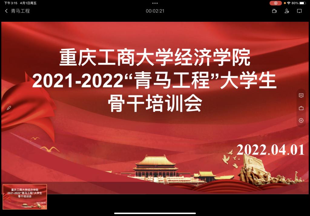 为深入贯彻习近平总书记重要讲话精神、落实团中央《“青年马克思主义者”培养工程实施纲要》文件精神,提升我院学生干部政治素养、理论水平。4月1日,太阳集团tyc122cc分团委组织全院学生骨干在博智楼302教室进行了2021-2022学年第二学期青马工程培训之“学党史,明信念,担使命”思想教育。为遵循学校疫情防控规定,会议采取了线上线下同时召开的模式。培训会邀请了管理科学与工程学院封海粟老师、校团委基层组织建设部陈琛老师、以及马克思主义学院魏新欣博士担任培训教师,课程包含演讲口才提升、学生干部综合能力提升、学习理解“四史”历史中的重要问题等相关内容。