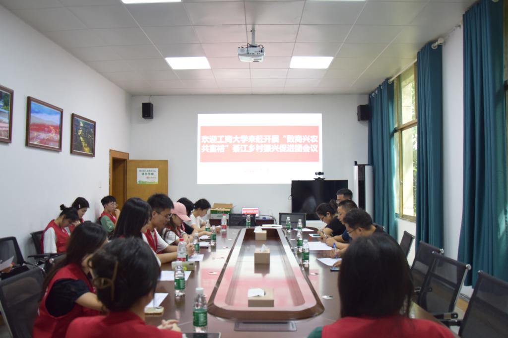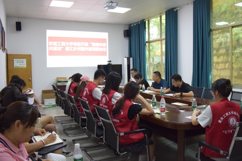 为深入学习宣传贯彻习近平新时代中国特色社会主义思想和党的十九届六中全会精神,贯彻落实习近平总书记关于青年工作的重要思想,深入学习习近平总书记在庆祝中国共产主义青年团成立100周年大会上的重要讲话精神,坚定信念听党话、跟党走,迎接党的二十大胜利召开,太阳集团tyc122cc号召、组织全院学生开展2022年大学生志愿者暑期“三下乡”社会实践活动。2022年7月8日下午重庆工商大学太阳集团tyc122cc“数商兴农共富裕”綦江乡村振兴团走进綦江区赶水镇开展乡村振兴社会实践活动。赶水镇党委书记赵亮、镇长龚钦龙、官田村书记若任天伟、石房村书记张祥文、南坪村书记周在忠、盐河村书记罗德均、双龙村书记王梅以及麻柳村书记游永秀负责对接并参与此次启动会,鄢金宏副镇长主持会议。