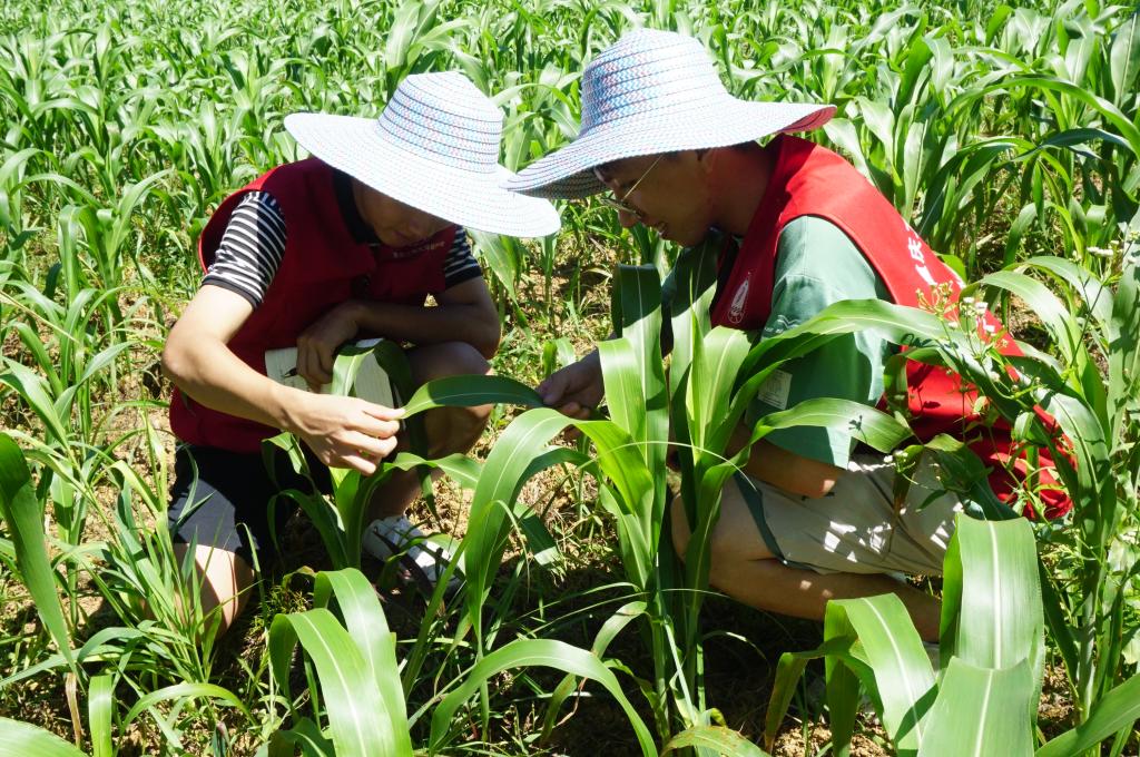 (促进团成员走进高粱地观察高粱长势)