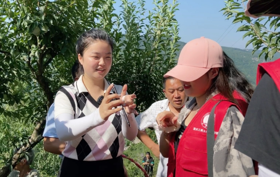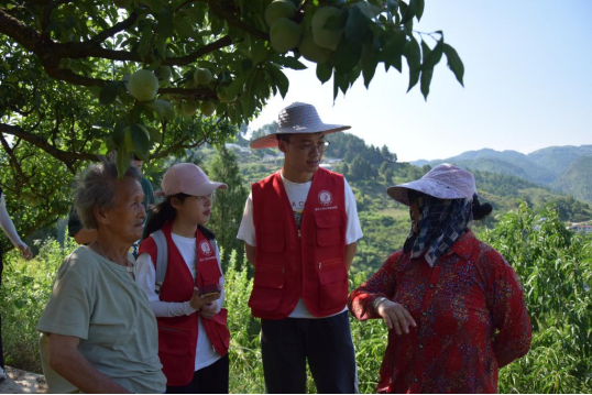 (促进团成员与当地农户在盐河村布朗李种植基地交谈)