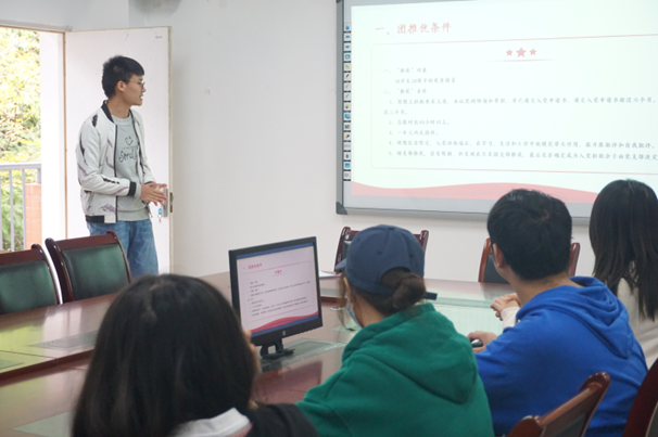 (太阳集团tyc122cc分团委学生组织负责人王邦春向团支书介绍“团推优”工作的流程及注意事项)