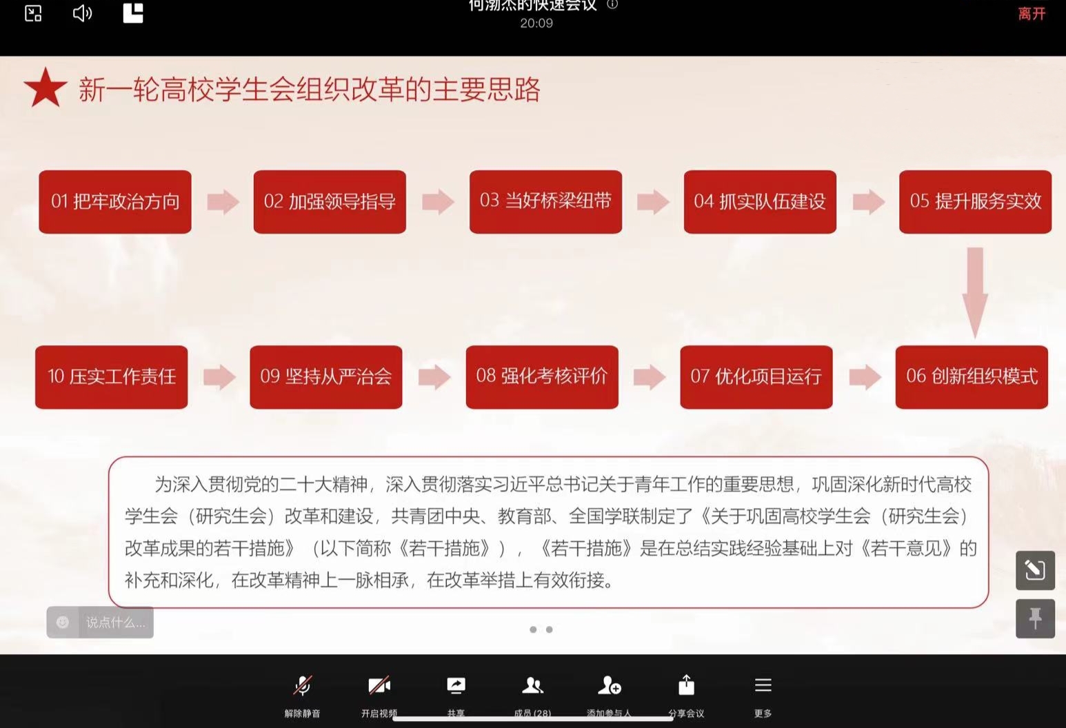 随后,余明同学为全体参会人员解读了《关于巩固高校学生会(研究生会)改革成果的若干措施》,解读主要包括以下四个方面的内容:一、深刻理解党对高校学生会组织的殷切期待;二、准确把握高校学生会组织改革的历史脉络;三、新一轮高校学生会组织改革的主要思路;四、抓实高校学生会组织改革的主要举措。在对相关文件的解读中,余明同学带领大家共同领会文件精神,把握核心内容,同时鼓励学院学生会全体成员发挥沟通党和大学生之间的桥梁纽带作用,加强自身建设,提高服务质效,为学院学生会发展注入新的生机和活力。