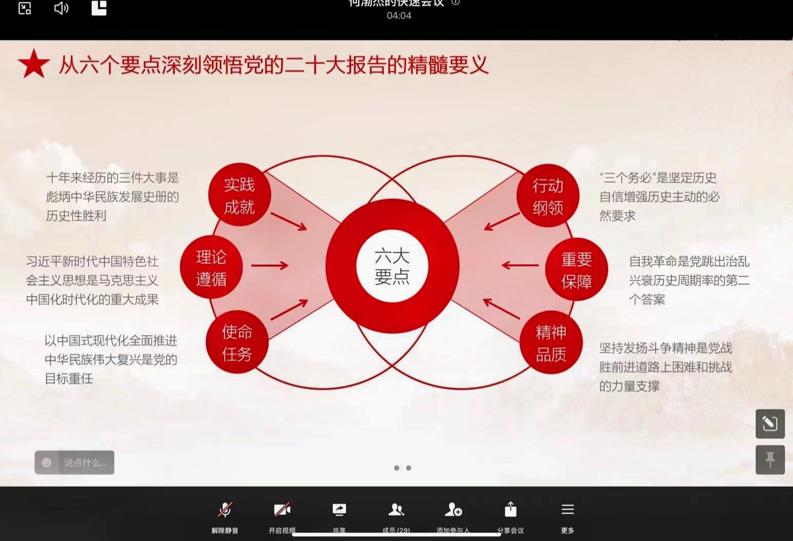 会议伊始,周川会同学带领与会人员从二十大报告的14组关键词入手,谈及新时代以来党和国家取得的历史性成就和发生的历史性变革,她表示,作为新时代高校学院学生会的工作人员,更要在实际行动中弘扬伟大建党精神,自信自强、守正创新,踔厉奋发、勇毅前行,为全面建设社会主义现代化国家、全面推进中华民族伟大复兴而团结奋斗。通过对二十大报告的学习,全体成员深刻领会了二十大报告精神的内涵与要义,将会在今后的工作中展现青年活力,发挥青年力量,。