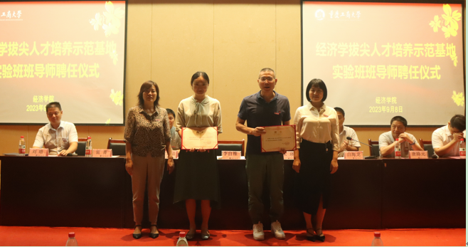 通过在全校2023级同学们当中进行二次选拔,学院组建了经济学实验班,实验班依托经济学国家级一流专业建设点和重庆市经济学拔尖人才培养示范基地建设,整合全校优质师资与优质资源,强化经济学拔尖人才培养。学院聘请了陈纪平教授和田园副教授作为实验班班导师,李自维书记和宋瑛院长为两位导师颁发了聘书。