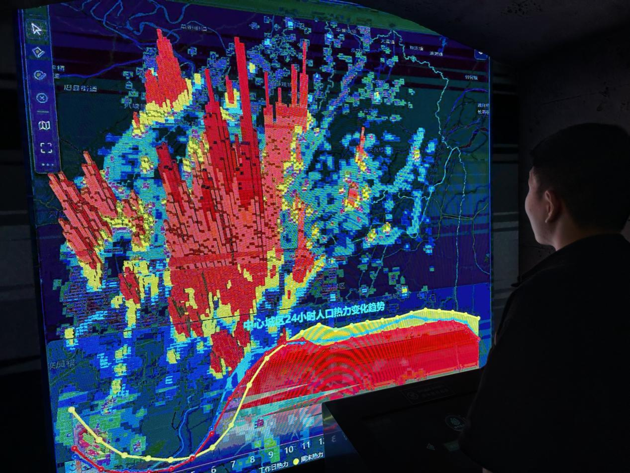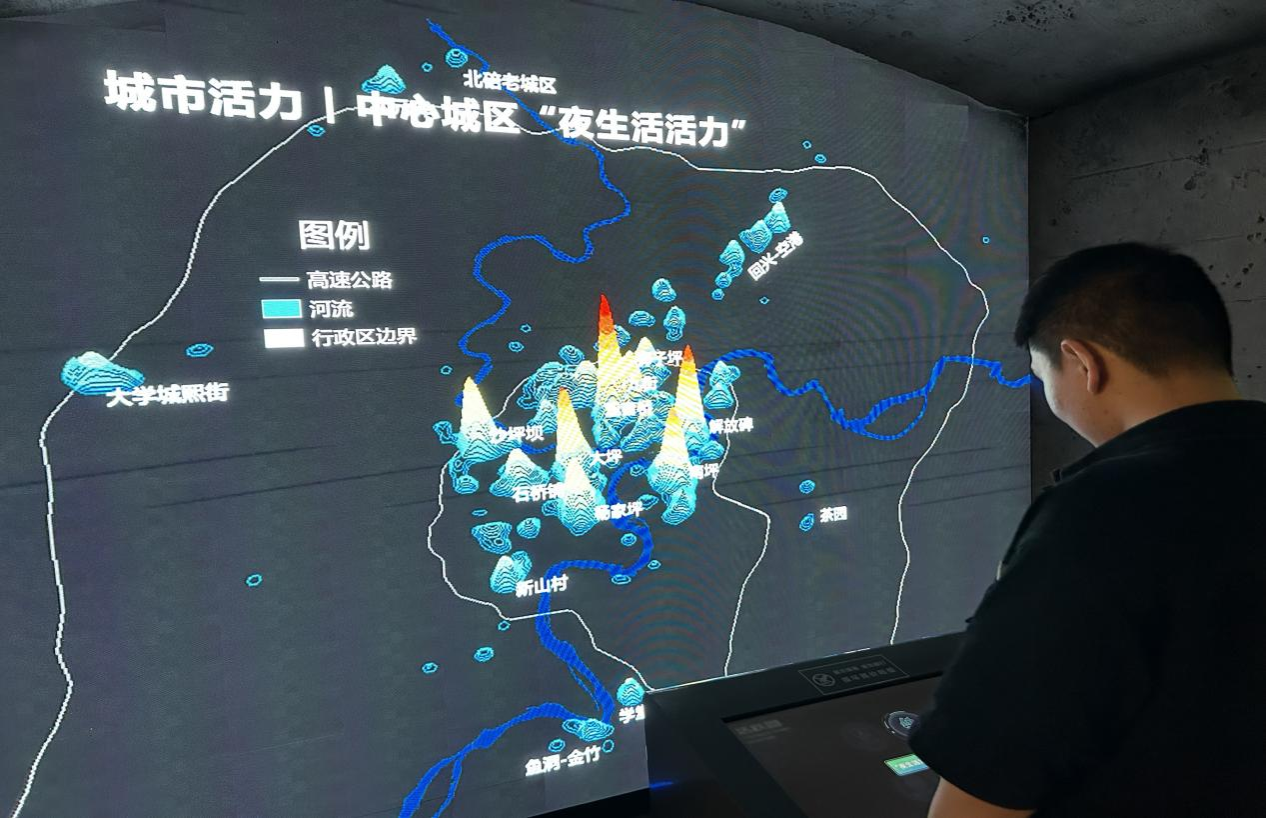 在城市活力数据统计面板前,团员青年们通过操作显示屏,进行设施活力、人群活力、夜经济活力、人口变化趋势等多个数据的不断变换分析,对重庆市中心城区的社会经济活力进行了解,从而加深对于经济社会生活的感悟。