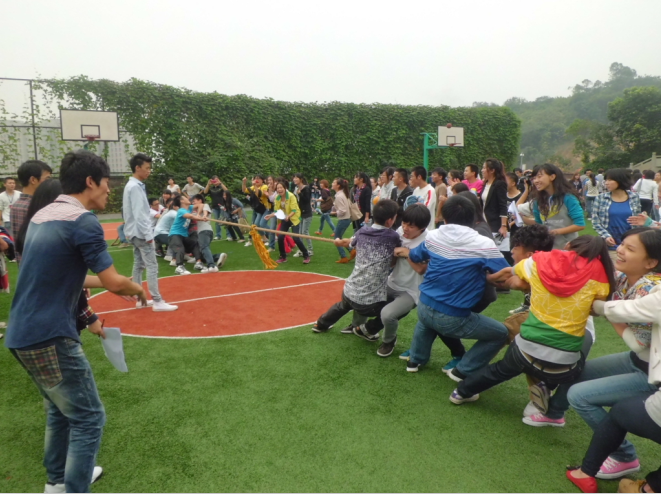 趣味运动会在激情四射的拉拉操表演中拉开序幕,分团委书记林新竹老师致开幕辞并预祝本次运动会圆满成功。运动会包括“八点一线”、“定点投篮”、“螃蟹接力赛跑”、“单脚穿衣”、“5人6足”、“拔河”六个项目,将竞技与娱乐相结合,内容多样、趣味十足。经贸学院11级各班9支队伍,在各项赛事中奋力拼搏,团结互助。参赛的选手个个摩拳擦掌,自信满满,各班的拉拉队更是热情高涨,加油呐喊声此起彼伏,全场气氛活跃,场面热烈。在激烈的角逐之后,大会选出团体前三名,体育道德风尚奖和最佳拼搏奖班级进行了表彰。
