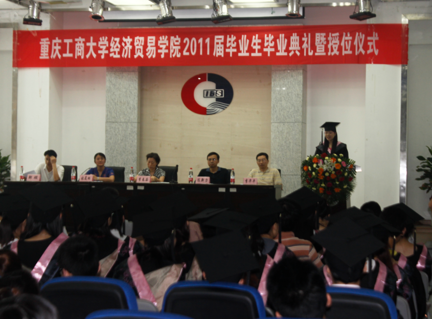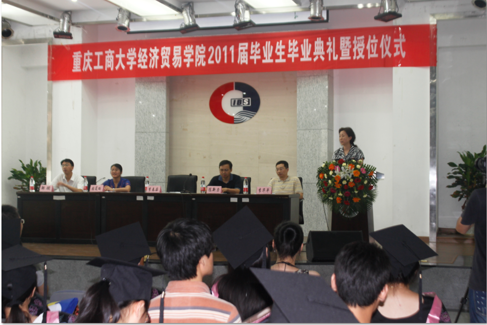扬帆起航就踏前程路,举帜挂旗正创锦华年。6月28日下午,重庆工商大学经济贸易学院2011届毕业生毕业典礼暨授位仪式在国际商学院报告厅隆重举行。莅临现场的嘉宾有学校党委书记李春茹教授,我院党总支张筱璐书记、陈新力院长、李华平副书记和邹璇副院长。参加典礼的还有各系主任(副主任),党政办、学团办、教务办主任(副主任),教师代表,2011届毕业生辅导员、班主任,校友代表,我院2011届全体本科毕业生、学生代表。典礼由我院党总支张筱璐书记主持。