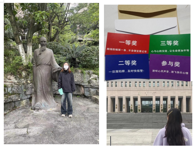 本次活动通过“校园寻宝”和“校园合影”结合的方式开展,参与的同学通过在校园中寻找印有防诈骗标语和心理健康标语的兑奖券完成寻宝,并与校园标志性建筑合影的方式记录活动。本次活动共吸引了60余位同学参加,最后通过寻宝数量和校园合照投票的评比,产生一等奖、二等奖、三等奖共35名。