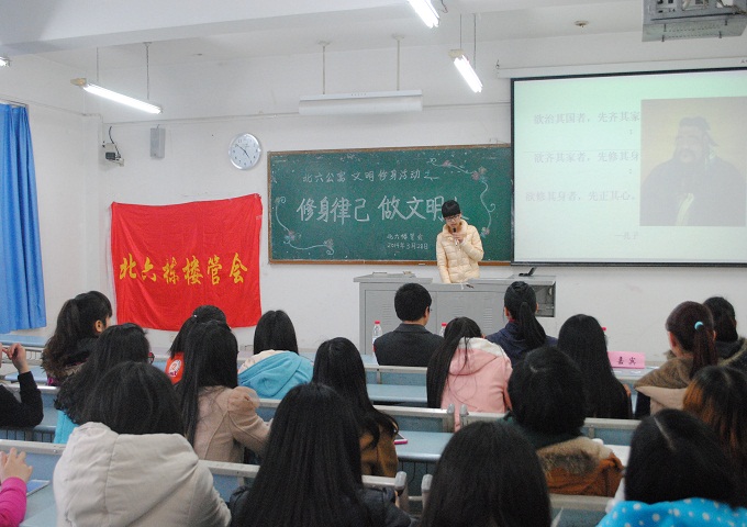 2014年3月28日下午,北六栋本着“服务学生公寓,创造文明环境”的宗旨在7404教室开展了“修身律己、做文明人”主题活动。参加本次活动的嘉宾有公寓管理科冯湛老师和北六栋楼管会主任郝颖老师,参与活动的有北六栋的楼栋干部和同学们。