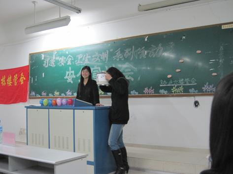 此次安全宣讲会突破了用ppt的传统形式,采用真人真景的形式向大家生动的展示了在楼栋中所遇到的各种安全隐患,其中包括防偷防盗、防火以及防推销等方面的表演。其次,以大功率电器的实物展示向大家阐述了其存在的危险性。进行安全宣传的同时,穿插了一系列的问答和猜谜环节,将活动现场的气氛推向高潮。最后,一个有关交通安全的相声结束了此次活动。活动结束后,冯湛老师对此次安全宣讲会作出了中肯的评价,并表示希望同学们能够将所吸收安全知识传递给更多的人,做到安全无隐患。