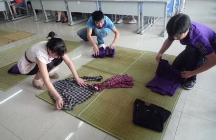 活动开始,冯老师向在座的各位同学强调寝室安全责任重大、寝室卫生刻不容缓,让同学们加深了对寝室安全卫生重要性的认识。此次活动注重以比赛的形式使卫生内务知识深入同学们的心中,活动主要分为四个环节,分别是知识竞答环节,捅被叠被环节,叠衣服环节和观看视频环节。在知识竞答环节中,分为风险题和抢答题,六组参赛选手展开了激烈的竞答,在抢答环节中也表现得非常积极,纷纷举牌抢答。捅被叠被比赛和叠衣服比赛迎来了活动的高潮,六组参赛组可谓是“八仙过海,各显神通”,每一组参赛队伍都拿出了他们的看家本事,纷纷快速高效地完成每一项任务。这一环节,由于有两对选手成绩相同,还额外进行一场“加时赛”,以谁叠的衬衣更整洁为判断依据。最后,活动以一段生活小窍门视频作为尾声结束。