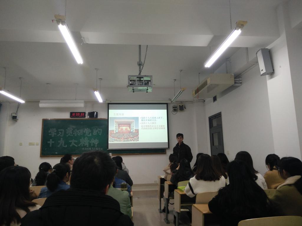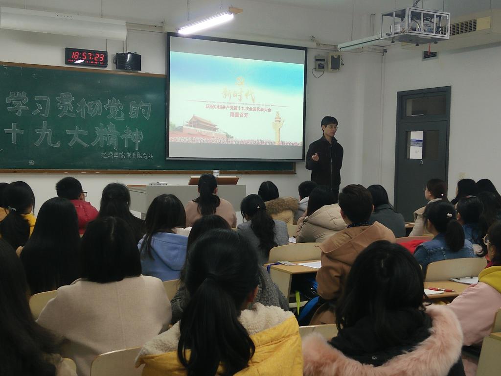 孙校长首先强调了十九大报告的重要性,是党发展上的重大转折点。经济的发展影响着一国经济的发展,经济类专业学生更应该关注时事政治,主动学习十九大报告。孙校长说:“总书记提到,我国社会主要矛盾已经转化为人民日益增长的美好生活需要和不平衡不充分的发展之间的矛盾,这些矛盾中,经济是很重要的一方面,你们的未来的发展正好与此天衣无缝地结合,你们做的事会很有意义”。接着,孙校长为大家全面剖析了会议的主题。在内容上,孙校长特别为同学们解读了十九大向青年提出的责任担当。青年是一个国家的未来,作为青年的我们要对祖国未来的发展充满信心,坚定信念,拥抱新时代,将中国梦作为奋斗目标。青年人要“有理想、有本领、有担当”,努力成为新时代的主力军和生力军。孙校长鼓励同学们,应该坚定地拥护中国共产党的领导,以学习贯彻落实十九大精神为人生奋斗的新起点,刻苦学习,提高本领,为母校争光,为党和国家的事业不懈努力。