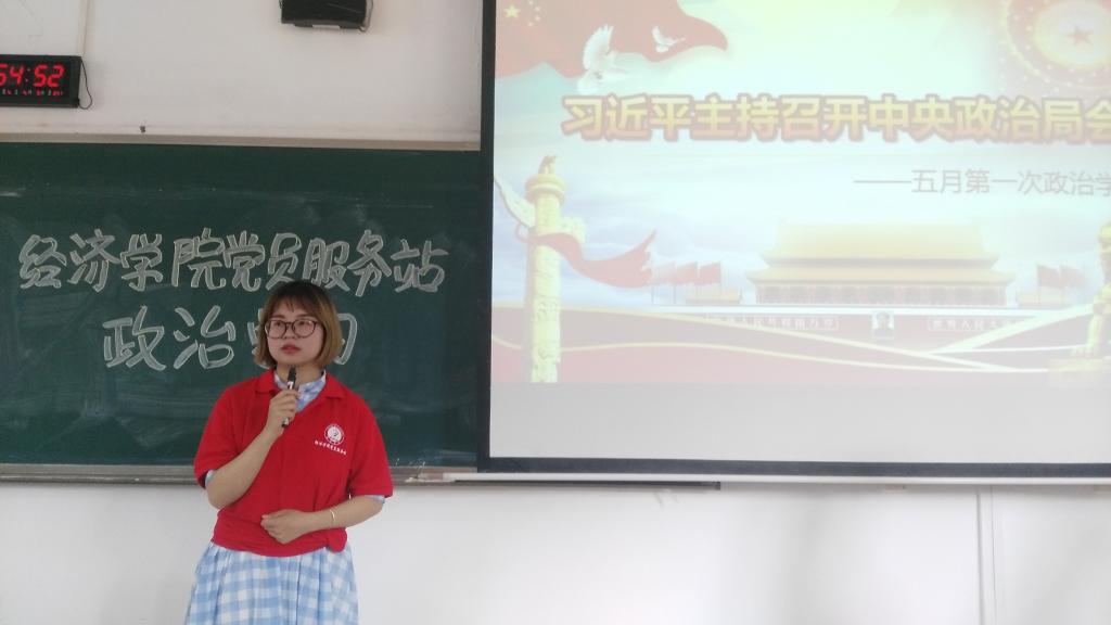 2017年5月4日,太阳集团tyc122cc党员服务站在07206教室开展了五月第一次政治学习,本次学习主题为“习近平主持召开中央政治局会议,分析研究当前经济形势和经济工作”,由新闻采编部部长汪科励主持讲解。