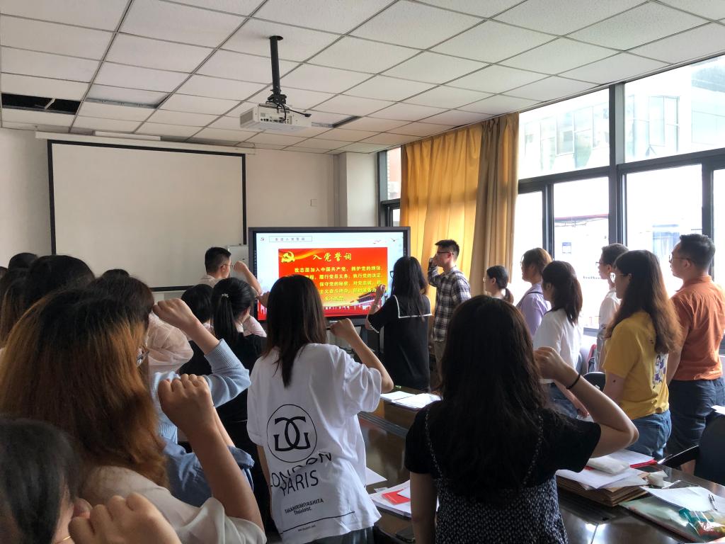 活动由支部宣传委员吴昊同志主持。他首先介绍了在建党一百周年之际重温入党誓词的重要性、必要性。随后,大家共唱《国际歌》,并在吴昊同志的带领下,全体党员一起高举右手,再次庄严宣誓。铿锵恢宏的誓词,强烈震撼着在场的每一位党员,一字一句,神圣而豪迈,铮铮誓言,体现了党员同志们对中国共产党的无限忠诚,坚定了入党使命,砥砺了奋斗初心。