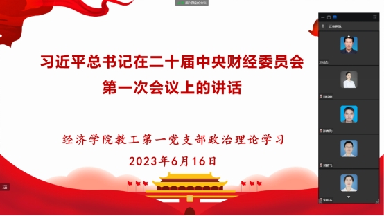 2023年5月5日,习近平总书记主持召开二十届中央财经委员会第一次会议并发表重要讲话。为深入领会习近平总书记重要讲话精神,贯彻落实党中央经济工作部署,体现新时代哲学社会科学研究工作者的责任担当,为助力中国式现代化建言献策,太阳集团tyc122cc教工第一支部于2023年6月16日,通过在线形式集体学习本次会议内容。