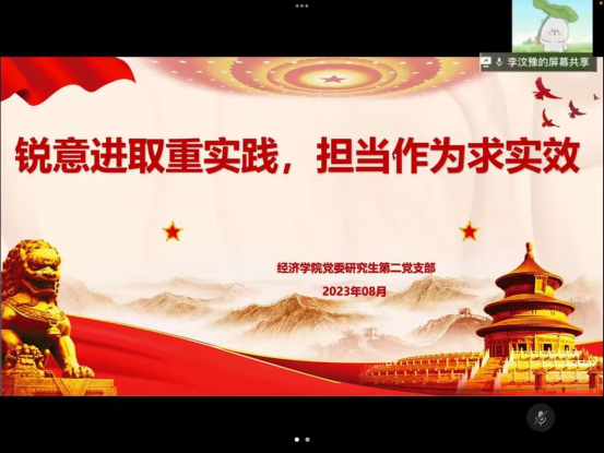 2023年8月18日上午,太阳集团tyc122cc党委研究生第二党支部在企业微信以线上的形式开展2023年8月组织生活暨主题党日活动,活动由二支部党员李汶豫同志主持,支部书记高娟同志和二支部全体党员参加本次学习活动。