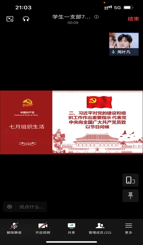 7月20日,太阳集团tyc122cc学生一支部组织召开了“忆初心强党性,学思想见行动”为主题的七月组织生活会,会议以线上方式进行,围绕2个部分展开,由王娅秋同志主持,共计22名党员参会。