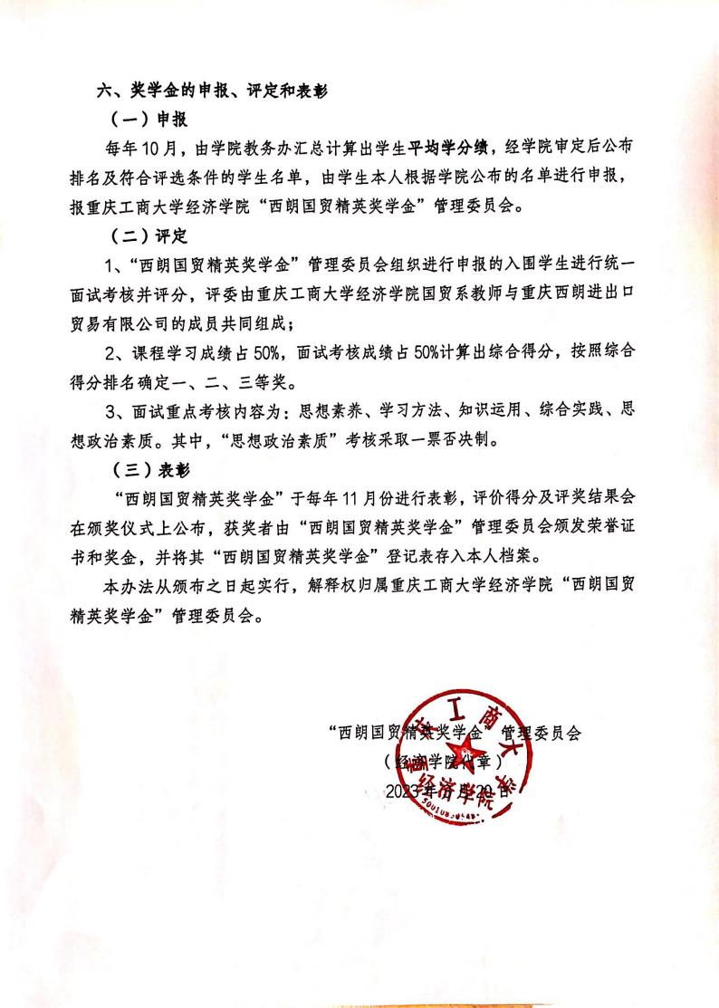 “西朗国贸精英奖学金”由重庆西朗进出口贸易有限公司捐资设立。该奖学金由重庆工商大学太阳集团tyc122cc西朗奖学金管理委员会负责管理。