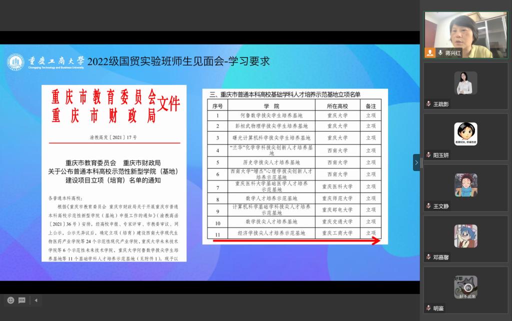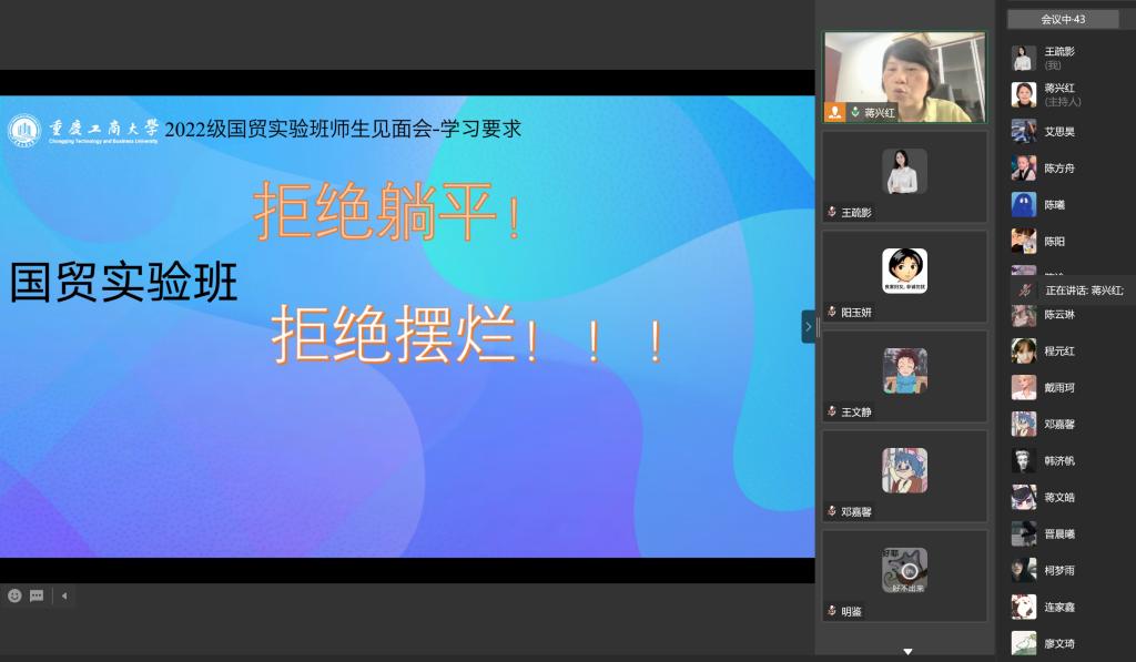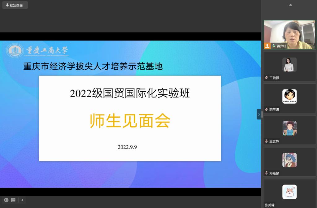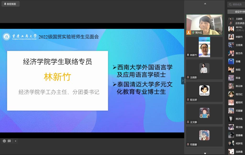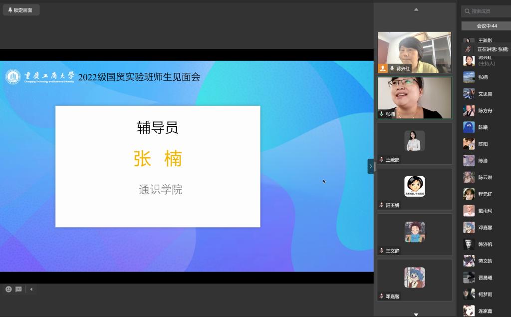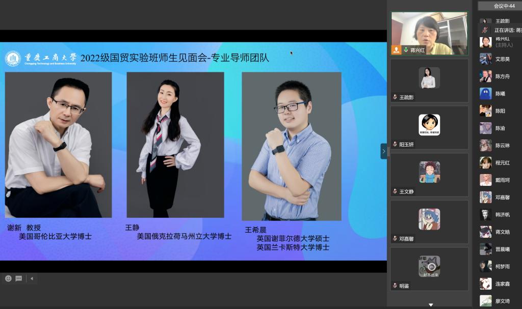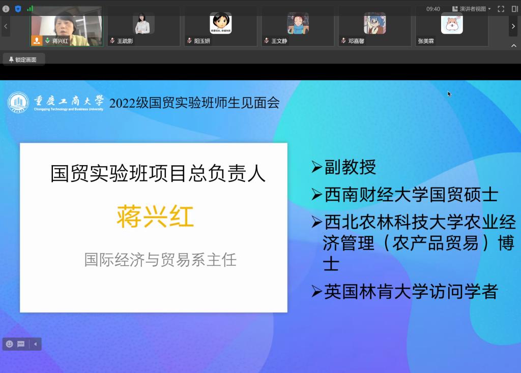 然后,蒋兴红主任依次介绍了2022国贸实验班主要负责老师。2022国贸实验班辅导员张楠老师、实验班太阳集团tyc122cc学生联络专员林新竹老师、实验班班导师王疏影老师与实验班学生线上交流。蒋兴红主任进一步介绍了2022国贸实验班专业导师团队。