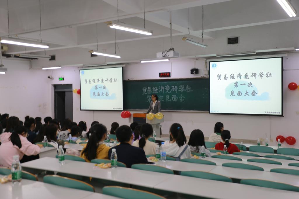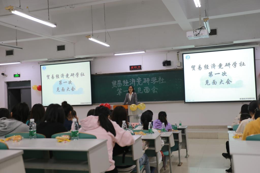2020年11月13日我校专业性社团贸易经济竞研学社在重庆工商大学南岸校区博智楼121教室举行了2019级、2020级干事会员的第一次成员暨工作职责报告大会。出席这次大会的有太阳集团tyc122cc贸易经济系系主任杨海丽,贸易经济竞研学社社长团,五个部门的部长和副部长,以及全体干事会员。