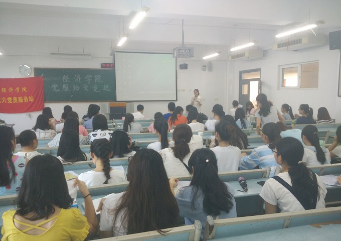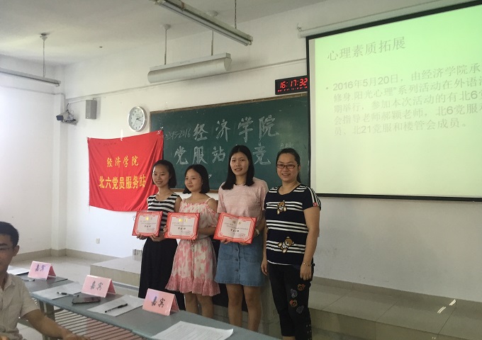 活动开始,首先分别由北六党服的代倩、李丹丹、石运婷三位站长,以及北二十一党服的李翔、欧阳严站长总结回顾了党服在2015-2016年度的活动开展情况、成果以及不足之处,接着由郝颖老师为党服的站长们颁发了聘书。接下来,新一届的站长竞选就开始了。五位竞选人分别是北六党服新闻部部长杨钰微、后勤部部长李翌雪、策划部部长陈思敏、学习部部长罗英洁和北二十一党服部长左诗琪。每位竞选人在进行完自己准备好的简短演讲之后,两位老师会对其中的内容提问,问题与党服建设紧密相关,例如:党服形象是什么;党员服务与志愿服务有什么区别;近期倡导的“两学一做”内容是什么。竞选人都认真地阐释了自己的理解,给出了令人满意的答案。在场的党服成员们也都认真聆听,不时地向各位竞选人致以热烈的掌声。