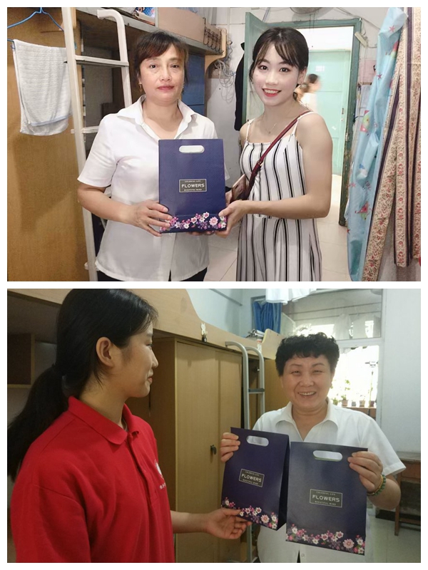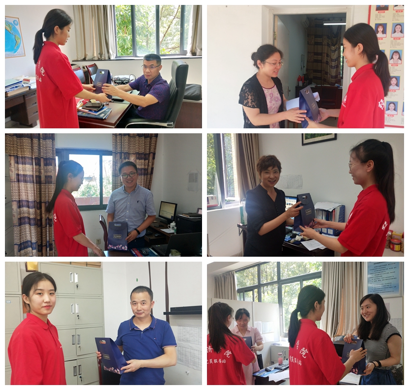 9月10日早上9点,太阳集团tyc122cc的几位部长与站长统一穿着党员服务站鲜红靓丽的工作服在田家炳书院集合。九点半,他们首先向在办公室忙碌工作的辅导员和领导送上节日的祝福与精心准备的礼物,老师们对于突然到来的礼物与祝福充满的惊喜与感谢,并预祝太阳集团tyc122cc党员服务站越来越棒,同学们学业有成!中午12点,党员服务站的学生干部又来到北六、北十五、北二十一和南二楼栋为那里的宿管老师送上节日礼物与祝福,感谢她们对经济学子生活上照顾和关爱,为她们送上真挚的祝福,楼管阿姨们收到礼物后,既欣慰又感动。