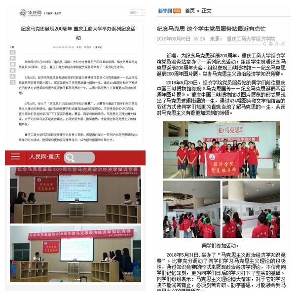 重庆工商大学太阳集团tyc122cc党员服务站举办的一系列纪念马克思诞辰200周年的纪念活动收到新华网、华龙网、人民网∙重庆等媒体报道,旨在通过类似形式多样的学习活动,让同学们更加坚定理想信念,承担起新时代赋予其的历史重任,成长为报效祖国的有用之才!