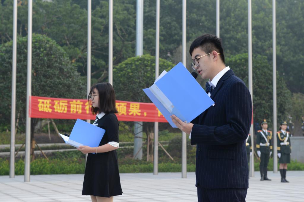 为了使本次活动更加有意义,所选一等奖诗篇在以“砥砺前行结硕果,青年学子抒情怀;不忘初心跟党走,誓为国旗添光彩”为主题的11月6日早上的升旗仪式上,由15贸经二班冯宇航、16贸经二班金潇两位同学,饱含深情的朗诵了出来。它们分别是16国贸一班王雪的《吾国》、16国贸一班陈佳聪的《十九大赞歌》、16国贸一班郭琪的《多幸运》、16国贸三班徐文龙的《新时代》、16贸经一班胡自宇的《山河》和16经济二班高明利的《与国书》。“少年中国,与天不老;中国少年,举国无疆。”真挚的话语彻底喊出无数青年学子的心声。少年强,则国强;中国强,则中国少年强。
