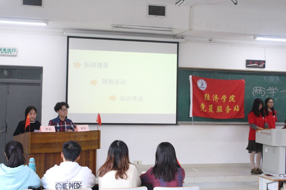 接着,党服新闻采编部,策划部,政治学习部为大家联合出演新闻播报节目。两名新采部干事结合当前播报了关于两学一做的时事,播放了关于两学一做的路人采访,随后,七名站员将会议生动演绎,在他们简单的一问一答间,传递了两学一做的真正内涵,让全体党服站员对两学一做,“学党规党章,学系列讲话,做合格党员”有了更全面更深入的认识。