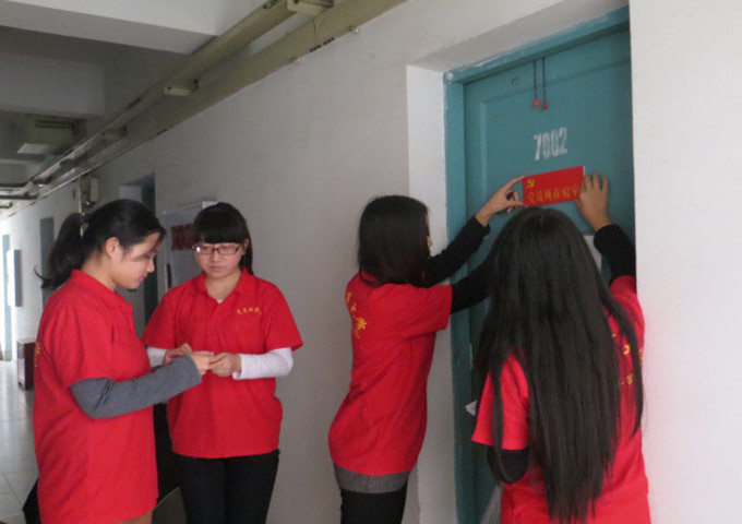 下午四点半,北六栋公寓静静的楼道上泛起阵阵脚步声,党服的站长们开始为党员所在寝室挂牌(党员所在寝室),和以往不同,本次挂牌采用塑胶泡沫制成,比往届所用的塑料纸更加鲜艳大方。百忙之中的郝颖老师也抽出时间来参加这次重要活动。经过老师和同学的配合,挂牌工作有条不紊的进行,积极而效率的完成工作,当同学们学习之后回到寝室,“党员所在寝室”的挂牌殊荣一定会同学们有更大的激励。最后挂牌活动有段小插曲,郝颖老师细心整理了楼栋的宣传栏,精心细致的工作态度给党服的每位同学树立了榜样。