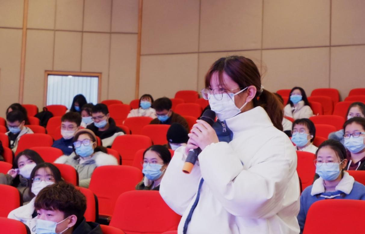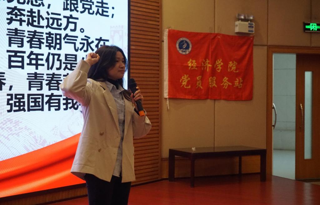听完李治贤老师精彩的讲述后,主持人邀请了两位同学分享其感悟与收获。其中,20级国贸三班的周叶凡表示青年学子应将个人价值与社会价值相结合,努力学习先进党员的优秀品质,为社会的进步与发展贡献自己的一份力量;20级国贸三班的李新荣感触颇深,她结合李老师的讲解,通过实例分析的方式论证了党和人民的无限智慧与伟大创造力,同时鼓励在场站员能够以史为鉴,不断汲取我党在百年奋斗历程中积累的经验与智慧。最后,太阳集团tyc122cc研究生代表汪林静带领全体参会人员进行宣誓。站员们高举右手、目光坚毅,共同许下了立志成才、报效祖国的誓言,在庄严肃穆的党旗面前更加坚定了为党的事业奋斗终生的决心和勇气。
