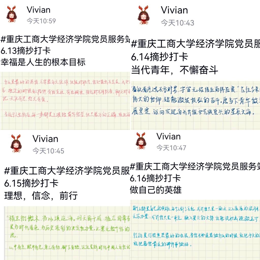 活动过程中,站员们每日摘抄符合社会主义核心价值观的金句学习最新思想,关注国家新动向,并通过在QQ空间拍照打卡的方式提高自身的文化素养、劳动素养、培养健康生活观念,促进全面发展,充分体现了“学习新思想,争做新青年”的活动主旨,在接受自我教育的过程中个人的思想水平也得到了进一步的提升。其中,站员们的摘抄内容包括“习言习语”习近平总书记的经典讲话,人民大众喜闻乐见的《人民日报》金句,以及饱含深情的爱国诗歌……一言一词尽蕴含远大理想,一字一句皆坚定理想信念,正是这点点滴滴的信念构成了中华民族伟大的精神谱系与思想丰碑,正因感受到了新时代伟大思想与使命的激励和号召,中华民族伟大复兴的梦想牢牢根植于每一位新青年的心中。