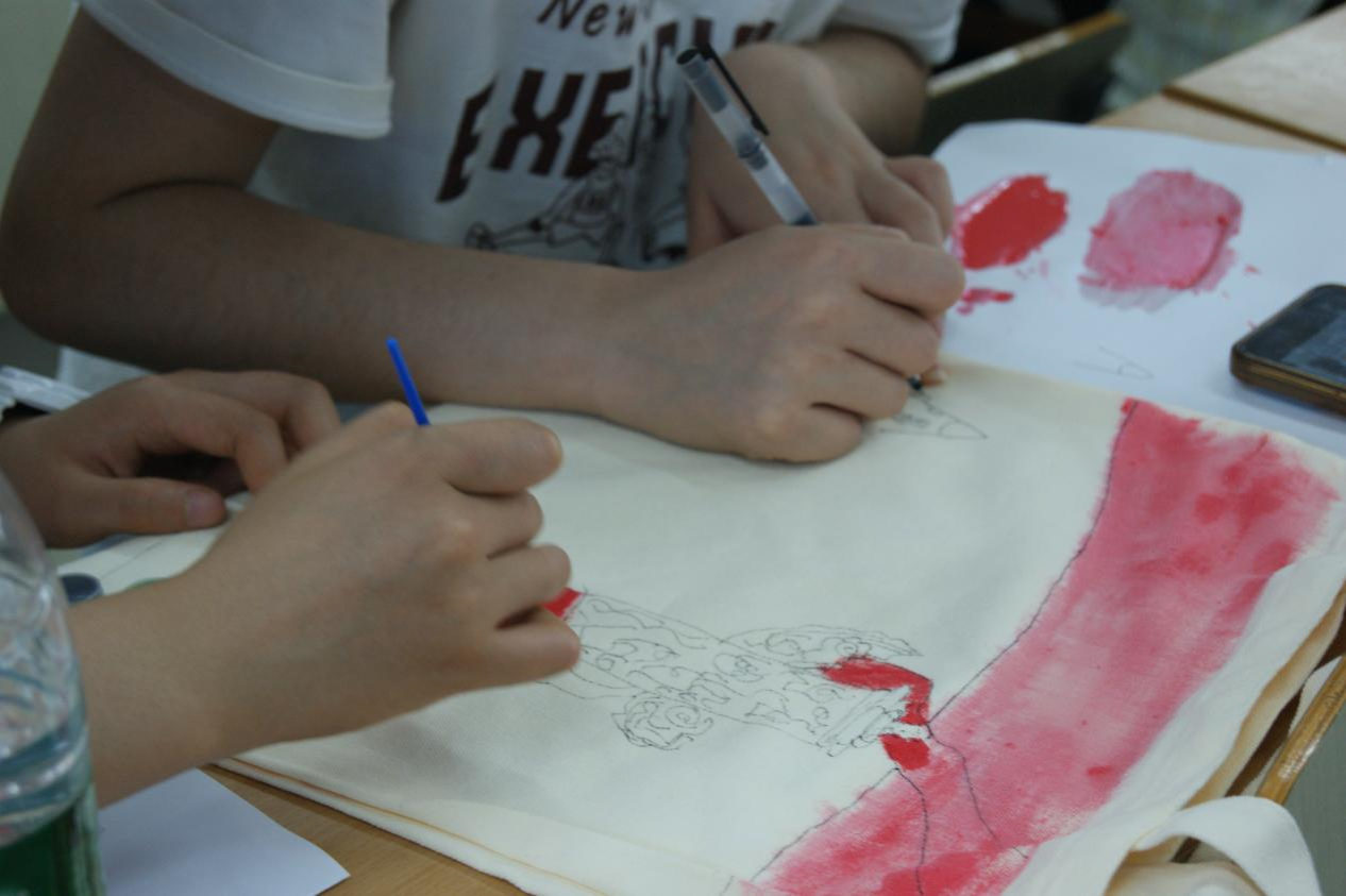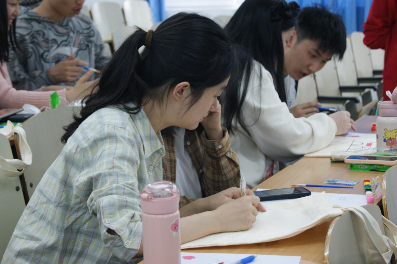 下午15时,活动正式开始。主持人通过红色故事向同学们讲述革命精神的历史与内涵,随后认真介绍绘画手法和颜色搭配技巧。同学们认真聆听,学习后跃跃欲试,纷纷拿起画笔仔细地进行调色、勾边、上色。在创作过程中,同学们满怀热情,或提笔勾勒,或填色涂画,以柔美的线条、鲜艳的色彩绘出一幅幅情感真挚、形象生动的画作。细腻入微的笔墨勾勒的是思维碰撞的青春个性,是对革命历史深沉的敬意和对美好未来的向往。经过同学们的认真创作,原本简单的白色帆布包被点缀一新,它不单是简单的收纳工具,更承载着同学们浓浓的爱党、爱国情怀。经过一个小时的精心创作,大家纷纷完成了自己的作品。大家边展示自己的作品,边互相交流创作技巧和其中的乐趣。不少同学表示此次活动让他们在学习之余体验到自主创作的乐趣,也加深了对红色精神的理解。