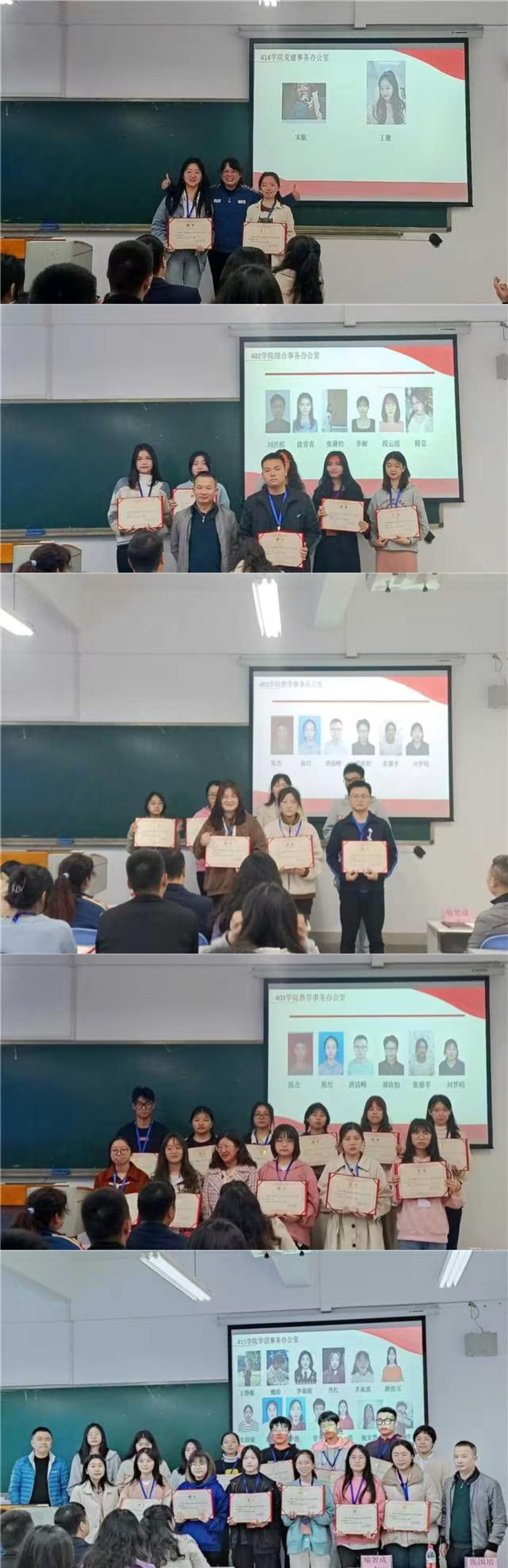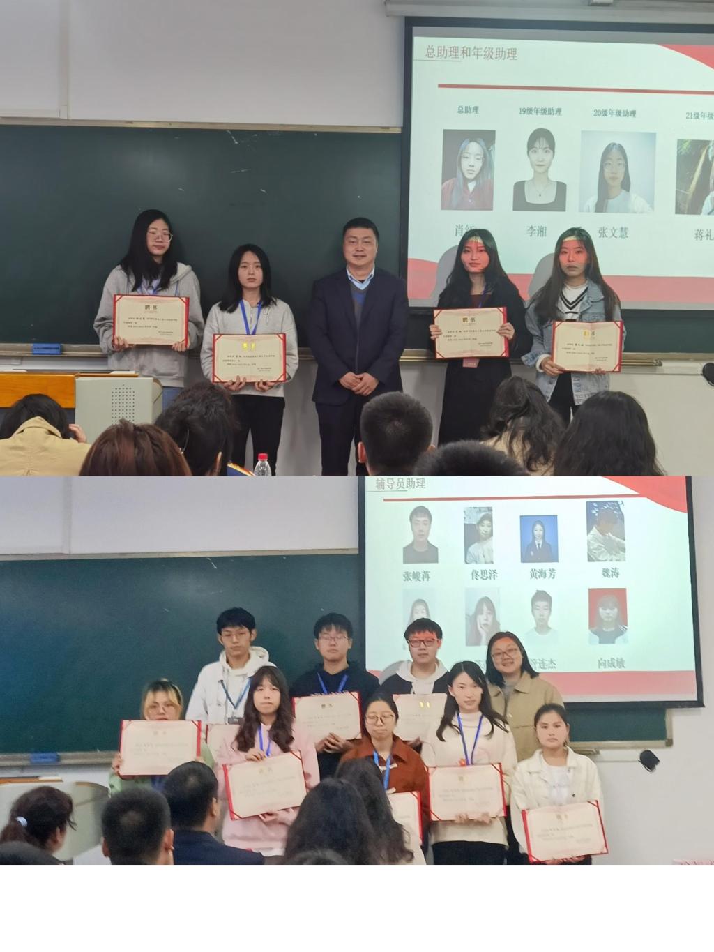 随后由各位指导老师依次为总助理和年级助理、辅导员助理和办公室助理颁发聘书并合影。