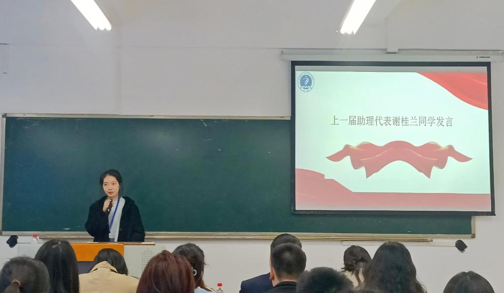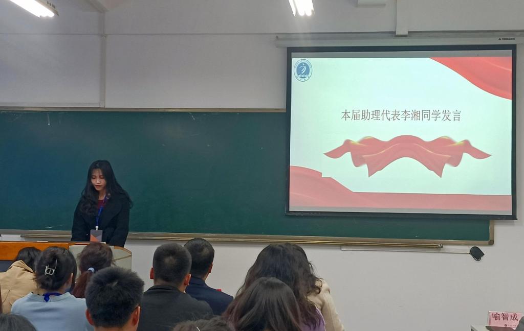 紧接着是本届助理代表李湘同学发言。作为新一届助理代表,李湘表示自己会克服各种困难,在接下来的助理工作中多问、多学和多做,不断提高办事效率,砥砺前行。