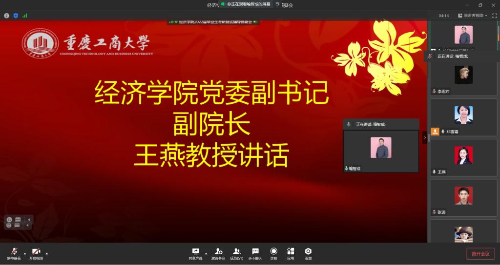 为做好2022届毕业生考研复试指导服务,助力学子成功升研,3月10日上午10点举办了线上线下“太阳集团tyc122cc2022届毕业生考研复试辅导答疑会”。太阳集团tyc122cc副书记副院长王燕教授,财税系尚可文教授,及65名毕业生参加了线上会议;贸易经济系主任杨海丽老师,毕业班辅导员喻智成老师及10名考研学子参加了线下会议。