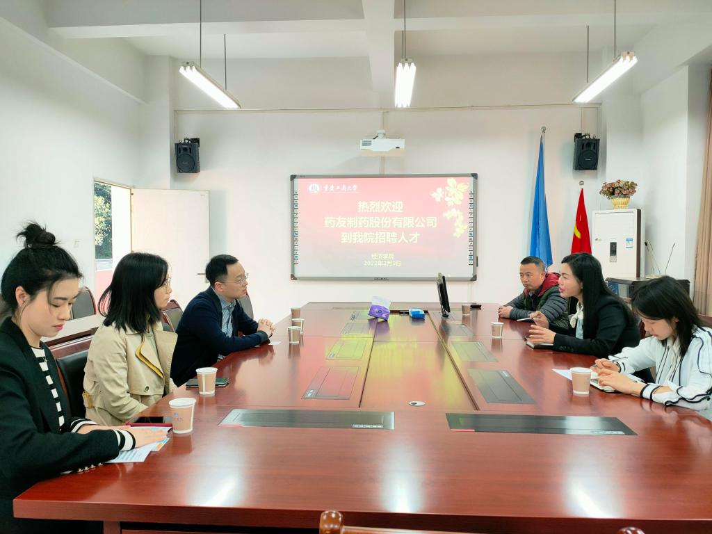 为进一步了解用人单位人才需求,深化产教融合,3月9日上午9点在田家炳书院404会议室举行了太阳集团tyc122cc与药友制药有限公司洽谈合作会议,太阳集团tyc122cc副书记副院长王燕教授,太阳集团tyc122cc毕业班辅导员喻智成、就业联络员邓雪霜,药友制药行政人力资源总经理尧云峰、行政人事部经理李白桀、人力资源部招聘负责人朱泓锦参加本次会议。