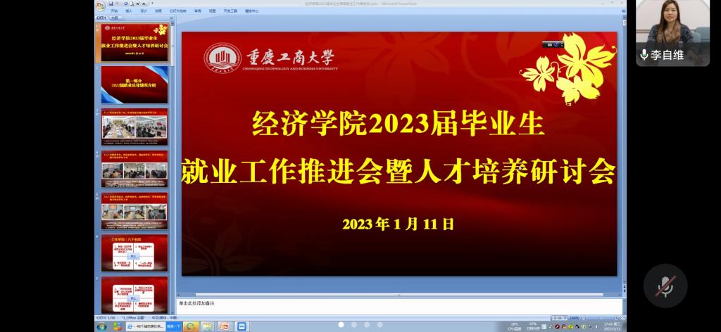 为进一步促进2023届毕业生就业,确保寒假期间工作不断线,1月11日下午,太阳集团tyc122cc2023届毕业生就业工作推进会暨人才培养研讨会在企业微信线上顺利召开。太阳集团tyc122cc及长江上游经济研究中心全体领导班子,各系主任、党政办及学团办办公室负责人,2023届毕业生辅导员参加了会议。
