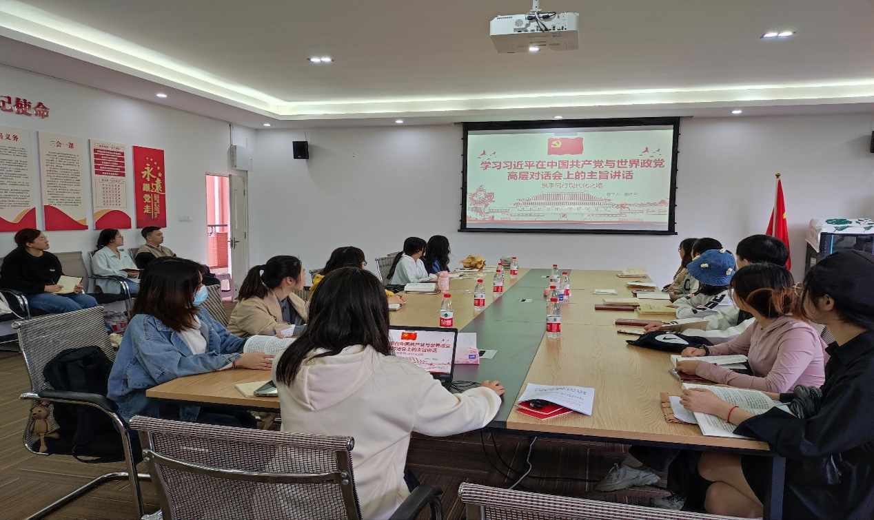 议程二为20级党小组代表领学4月份的组织生活学习内容。会上,四小组代表李敏同学分享了《习近平在十四届全国人民代表大会第一次会议上的重要讲话精神》,其中提到高质量发展、坚持人民至上、从严治党等发展“密匙”;五小组代表谢桂兰同学就《习近平在中国共产党与世界政党高层对话上的主旨讲话》展开领学,向所有同志介绍了我国推进具有本国特色的现代化事业,在促进全球文明交流互鉴以及推动人类命运共同的决心;六小组领学代表赵露佳对《习近平在中共中央政治局第四次集体学习时的重要讲话》,内容涉及到八个明确、十四个坚持以及六个必须坚持,这次学习的讲话精神有增强党的战斗力、学习马克思主义以及知行合一。议程三为19级党小组长代表交流4月份的组织生活学习内容,19级的三位交流代表联系实际工作、生活以及学习情况,与其他党员同学分享学习心得和体会。第一小组代表李南希同学、第二小组代表李卿尔、第三小组代表彭洪桎分别就《习近平主持二十届中共中央政治局第四次集体学习》、中共中央办公厅印发《关于在全党大兴调查研究的工作方案》、《习近平在中国共产党与世界政党高层对话上的主旨讲话》与各位党员同志交流了想法、碰撞了思想。