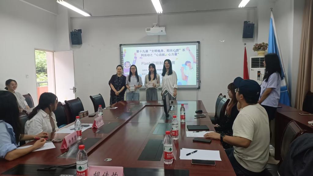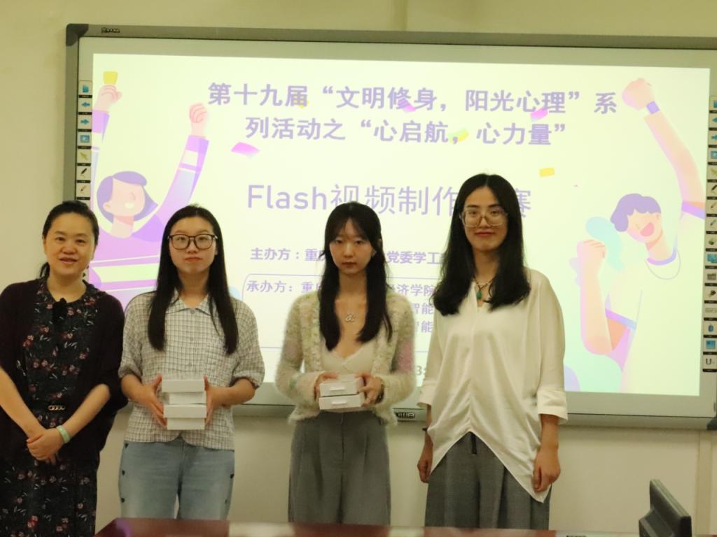 活动末期,胡佳怡老师和刘璐老师为参赛同学颁奖并合影留念,随着同学们热烈的掌声,此次心理flash视频制作大赛正式拉下帷幕。本次活动,通过制作flash心理视频的方式,为同学们搭建了展示内心真实声音的新舞台,增强了同学们认识自我、取悦自我、发展自我和完善自我的能力,以积极向上的心态自信地面对校园生活。