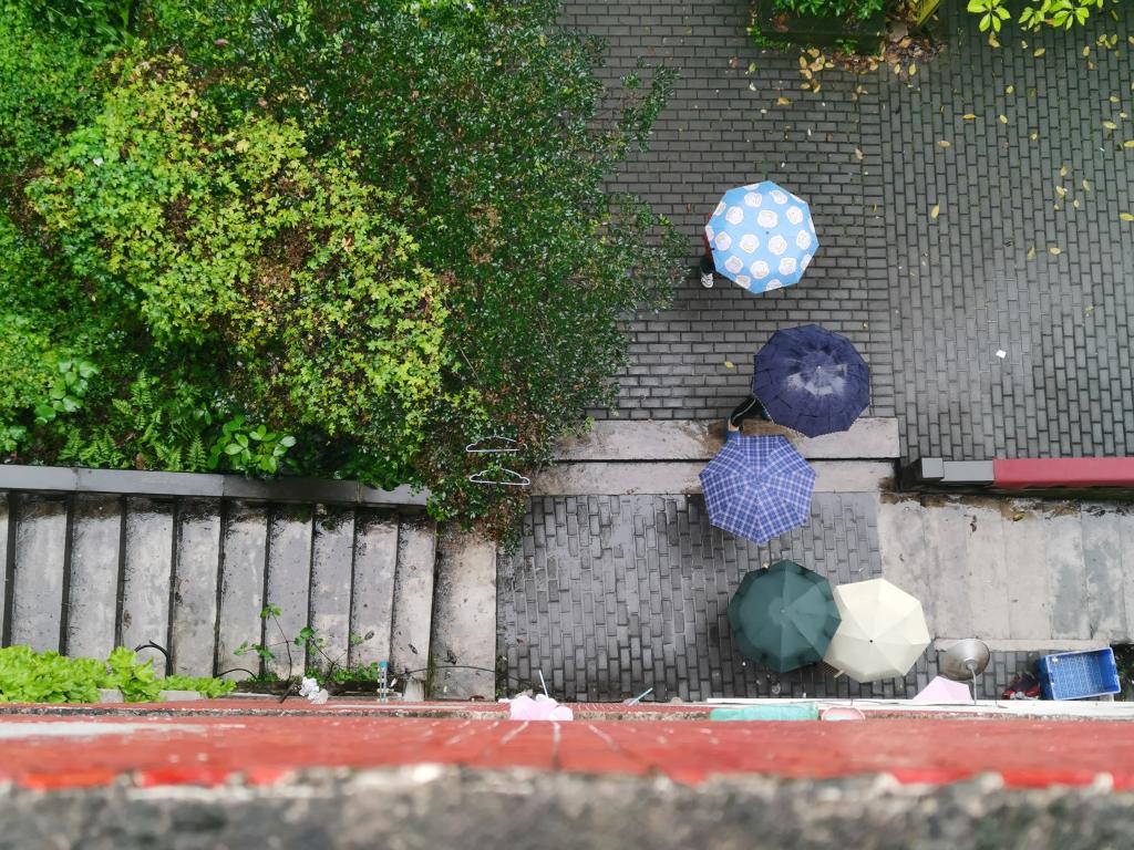 春雨绵绵,雾气笼罩,我听到雨声轻轻落在树叶上的声音,看到充满生机的一片绿。从阳台往下望,红色的墙边与青色的砖瓦静静的立在那里,一个个学生撑着不同色的伞缓缓经过。画面便增添了更多色彩。