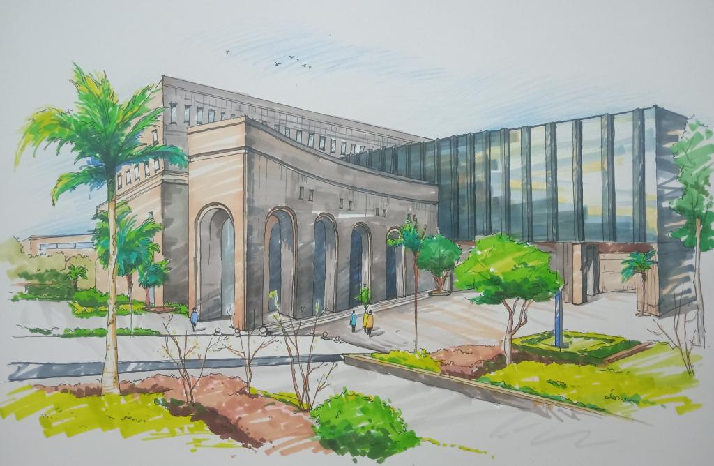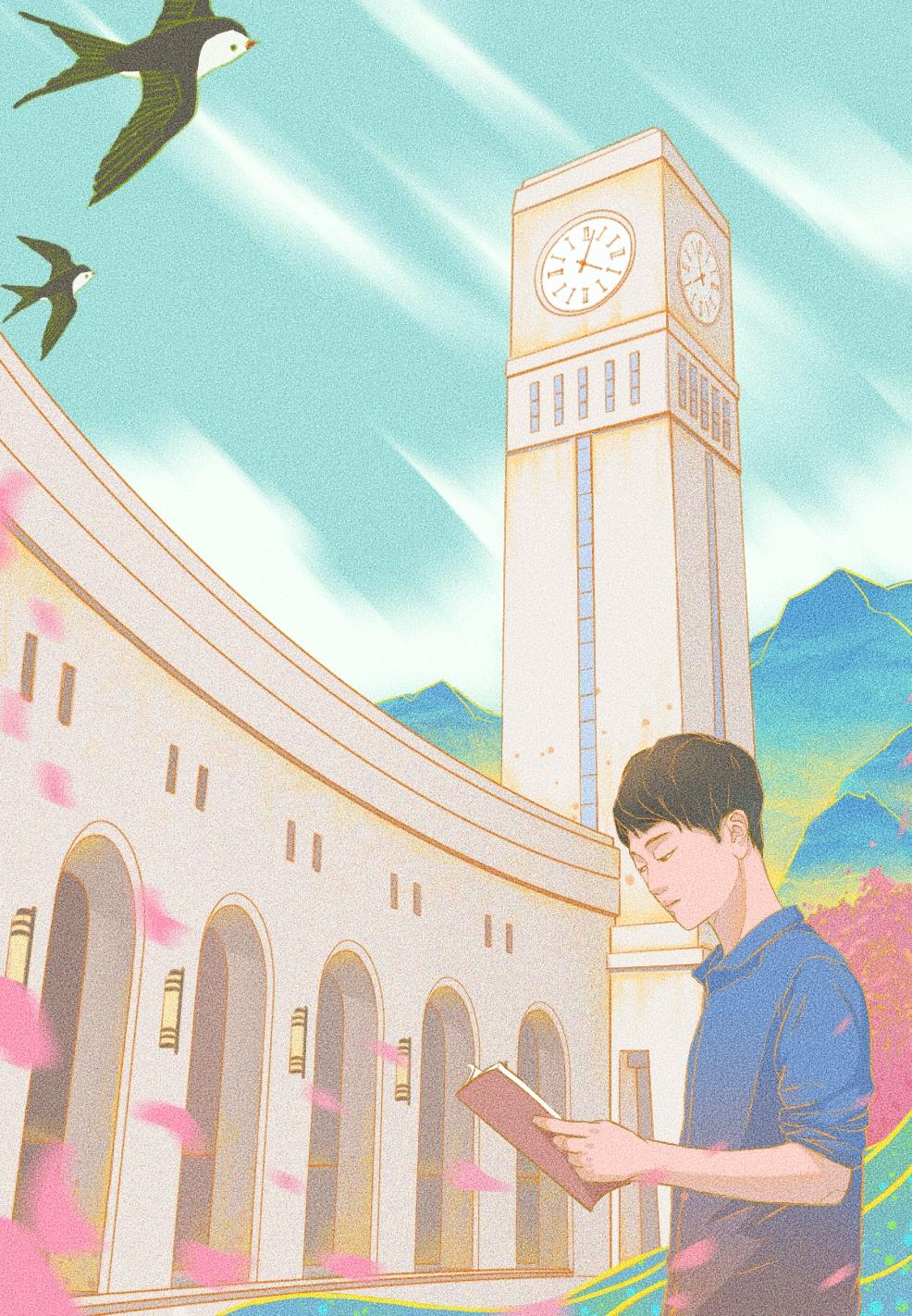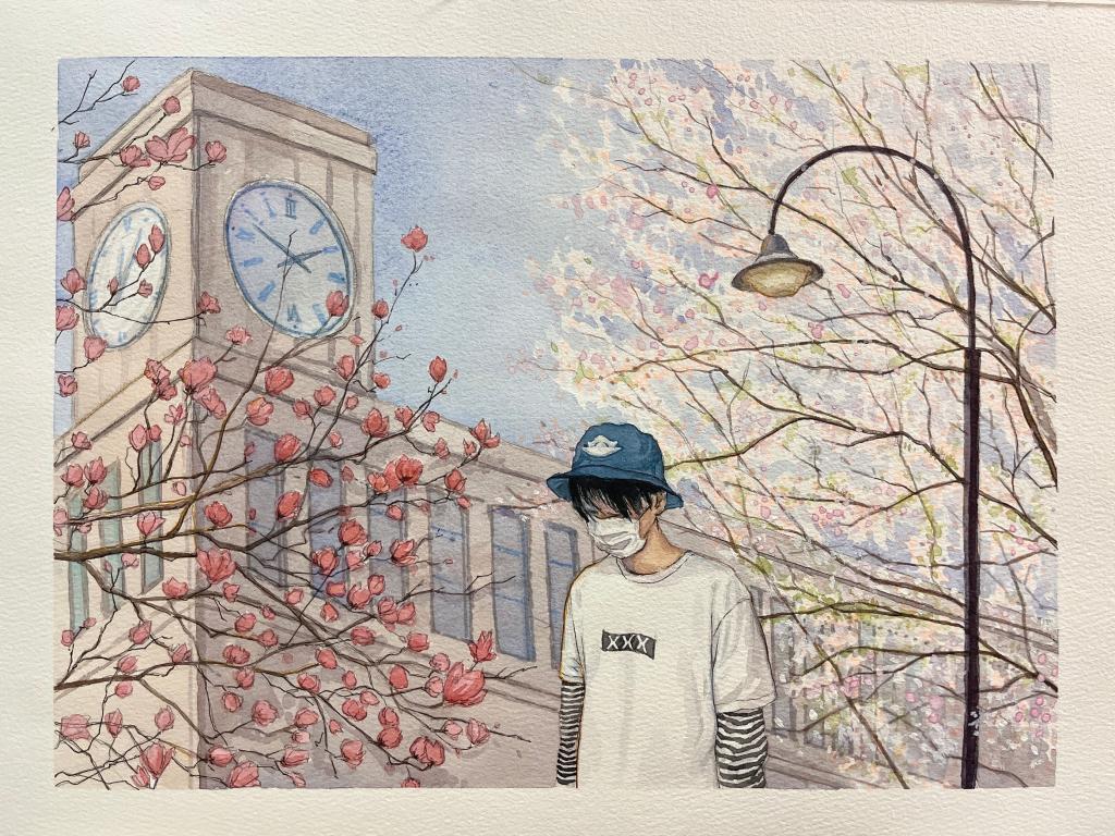 绘画作品灵感取材来源于学校的标志性建筑图书馆,燕子和桃花表现春日时节,图书馆前同学看书表现春日疫情下同学们学习情形。