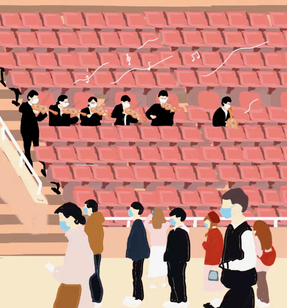 作品灵感来源于上海海事大学党员拉小提琴为同学“驱赶”检测核酸排队时的烦躁。表达了1、党员干部积极作为2、人性化管理与关怀3、学生积极向上的心态