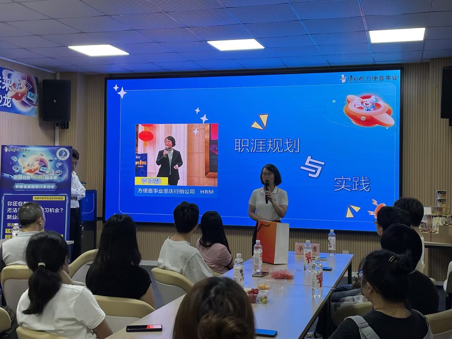 重庆康师傅方便面行销公司人资处李晓静经理从外部环境分析、定位职业大方向、职场位置认同、如何职涯规划等方面对职业规划进行分析并提供了宝贵的建议,并对康师傅方便面事业从培训体系、路径,选育等方面进行介绍,在实践方面对暑期实习生招募基本情况进行推介。