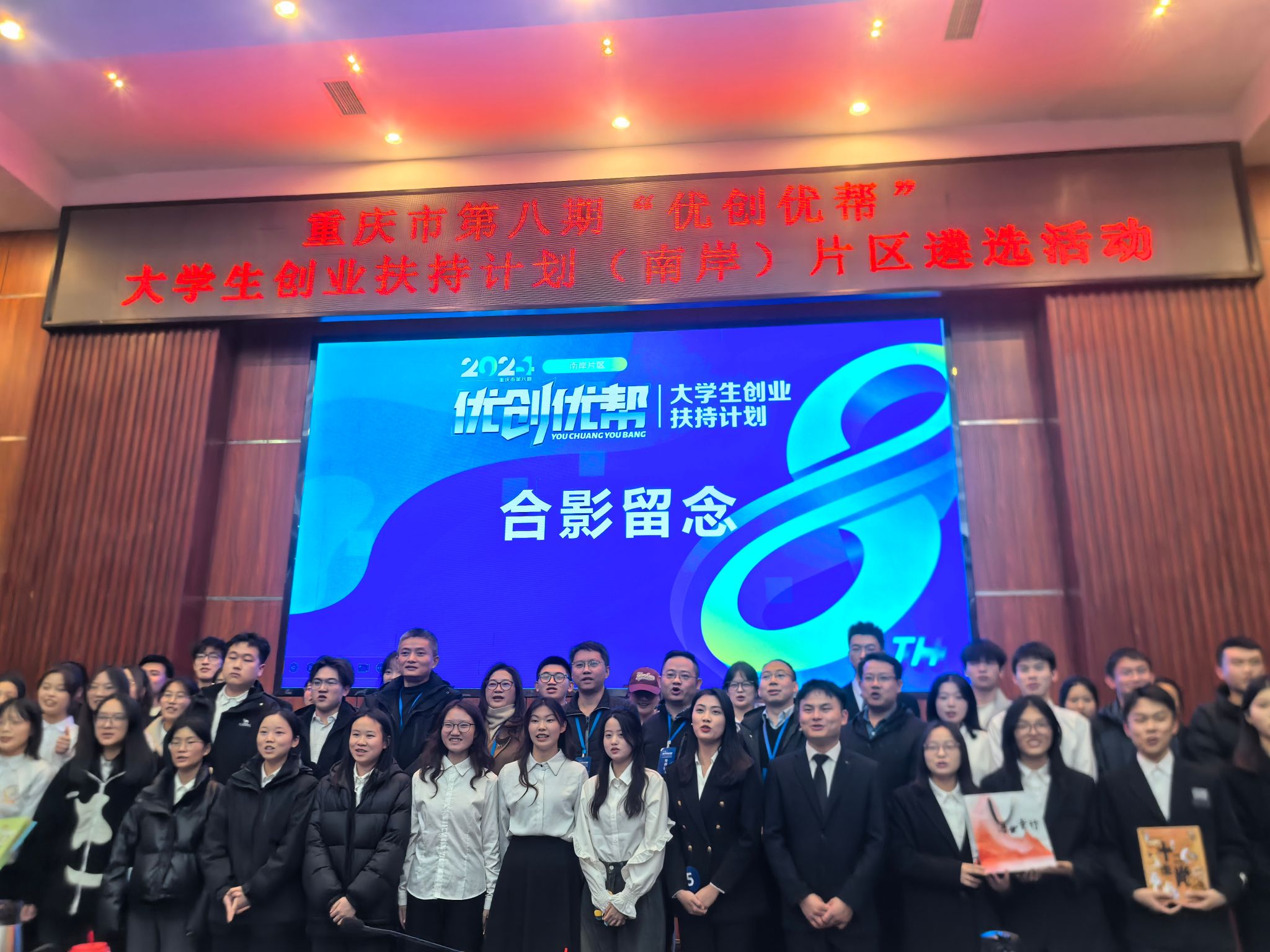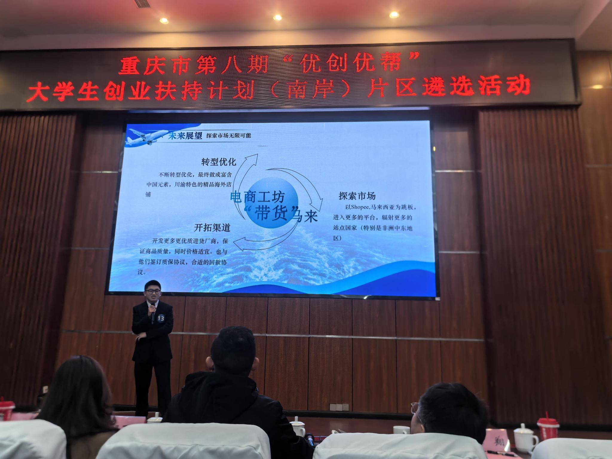 12月5日,重庆市第八期“优创优帮”大学生创业扶持计划南岸片区遴选赛在重庆第二师范学院举行。太阳集团tyc122cc由辅导员陈璐带队22级国贸专业“翠湖青年K7跨境电商工作室”负责人冯凯奇团队前往参赛。