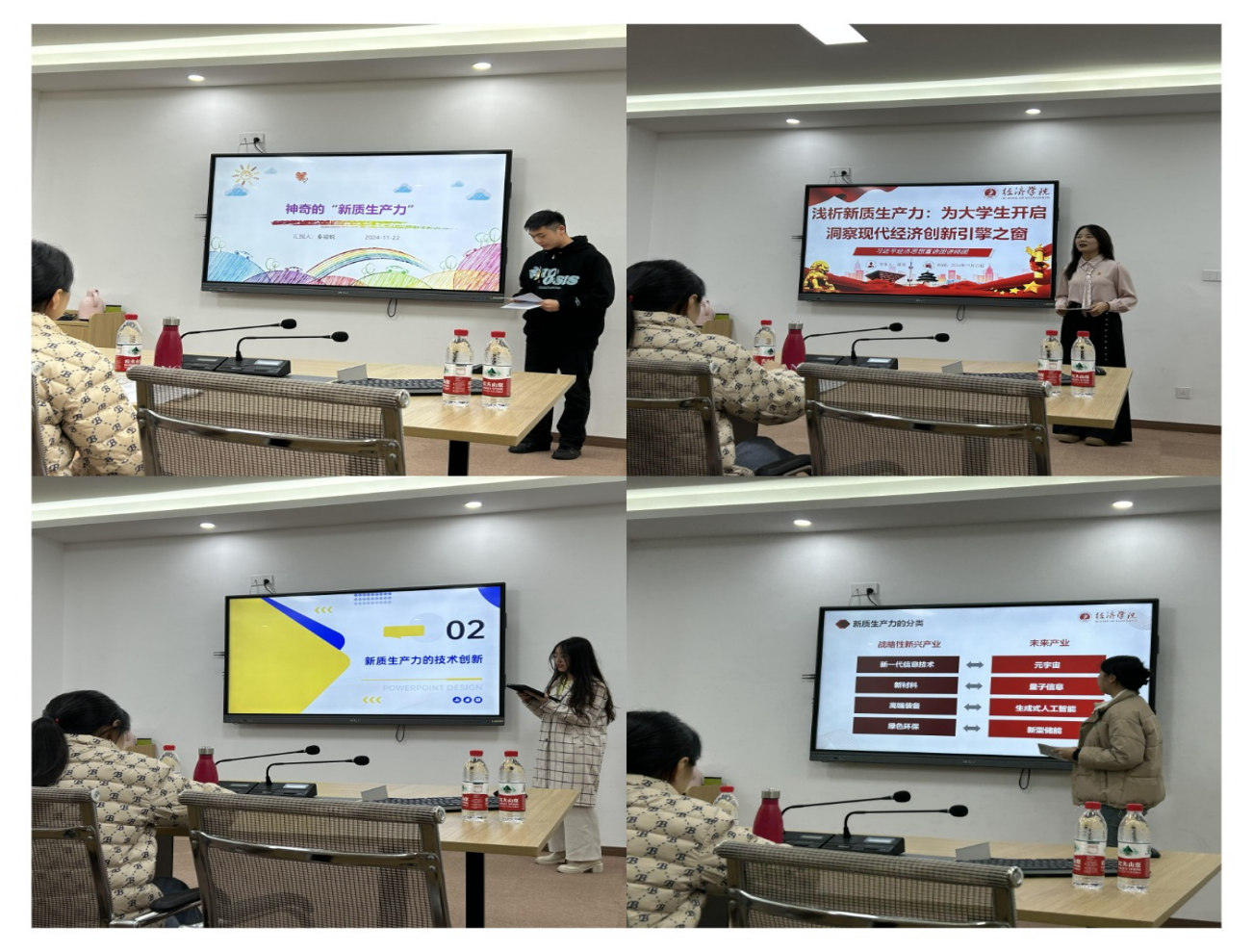 活动中,学生讲师以 “何为新质生产力”为主题,围绕自己对新质生产力的理解,结合日常生活学习中的思考,对如何推动高质量发展展开宣讲。其中,卢笛雅同学以武汉 “萝卜快跑” 无人驾驶出租车运营为例,将新质生产力比作推动发展的 “新引擎”,深入探讨了其在多领域的体现与影响,进一步阐述了新质生产力的内涵、背景及意义,使复杂概念变得通俗易懂;秦福锐同学把目光聚焦于小学生的认知世界,将新质生产力与日常生活紧密结合,用简单的文字和图片,展现其在人工智能学习软件、大数据购物及绿色环保技术等多领域的奇妙运用,激励小学生培育创新思维,养成环保习惯,踊跃投身新质生产力发展浪潮;周星宇同学深入剖析新质生产力于科技创新领域的关键意义,分享了受邀参观 “重庆数字大厦” 的独特实践体验,生动描述了其中的风力发电智能安检系统、电动车编译器、算力实验室等高新技术,让新质生产力概念更加鲜活。