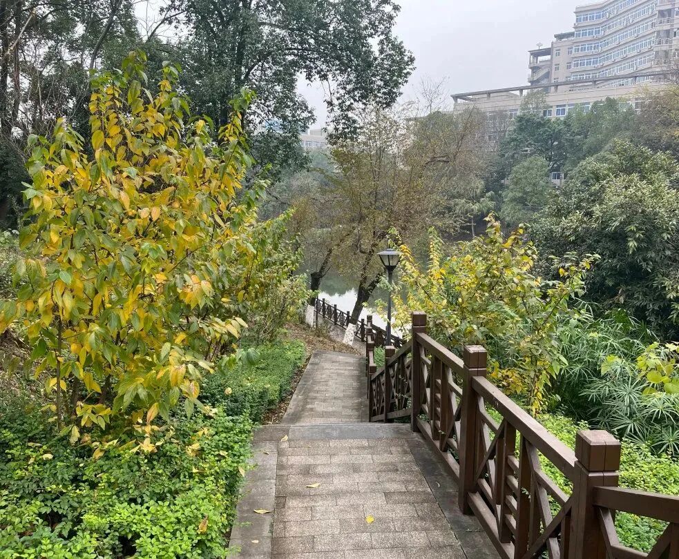 蜡梅环绕翠湖分散种植,一月沿翠湖而行,时有暗香,即为蜡梅。北区国商旁有一段步梯,步梯旁也有蜡梅。